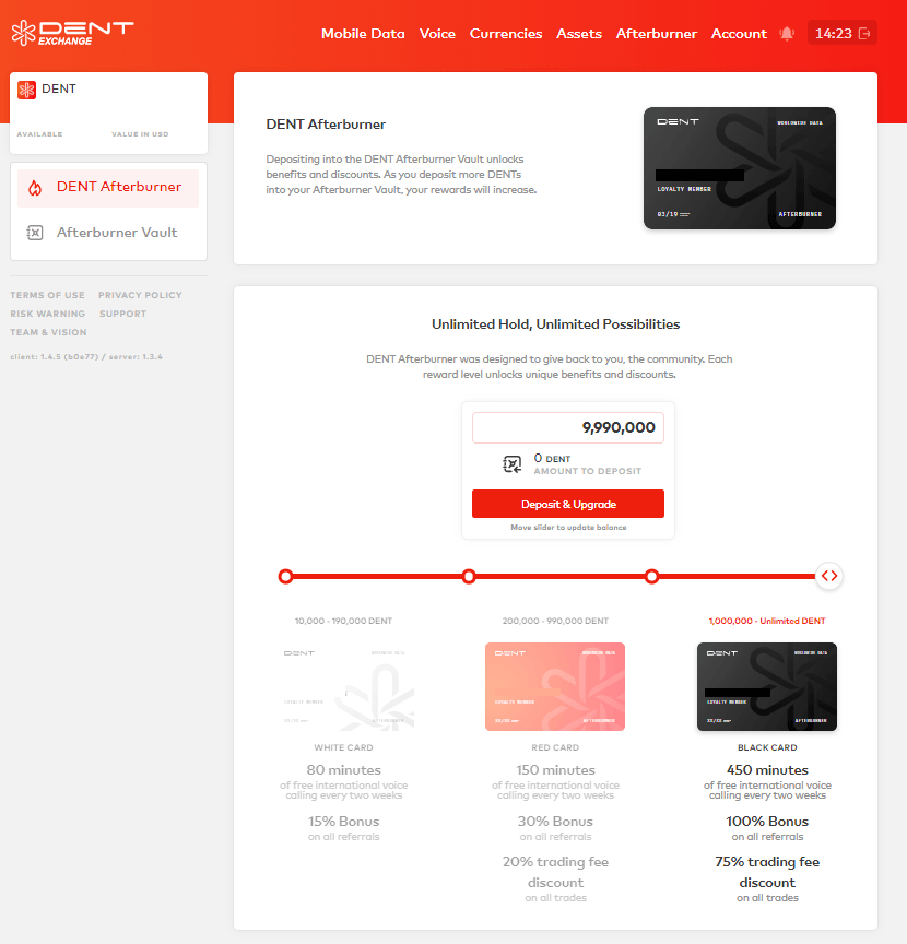 The DENT Afterburner is a loyalty program, in which DENT App users and DENT Exchange users can deposit DENTs into a personal vault and enjoy a variety of loyalty benefits. By locking some of your DENTs, you’ll receive higher daily rewards within the Earn tab, higher referral bonuses, reduced trading fees and free voice minutes. There are three different membership levels, White, Red, and Black, offering different rewards.