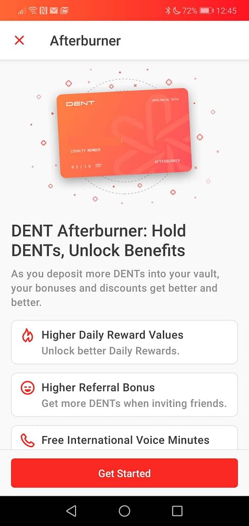 Just hit the Get Started Button and deposit a certain number of DENT into your Afterburner Vault. The DENT is locked up for 30 days, and you’ll get access to your benefits immediately.