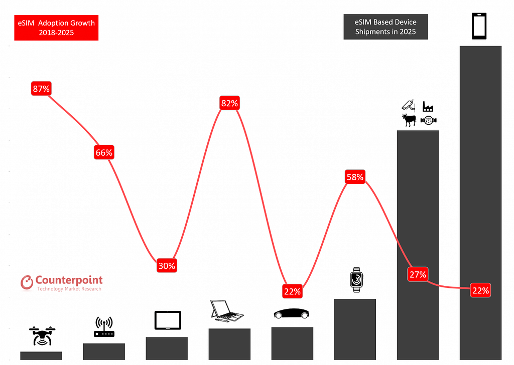 A little older report from Counterpoint but with a nice overview of the expected average growth rate in 2018-2025 for all different devices that will use (hardware) eSIM in the future…